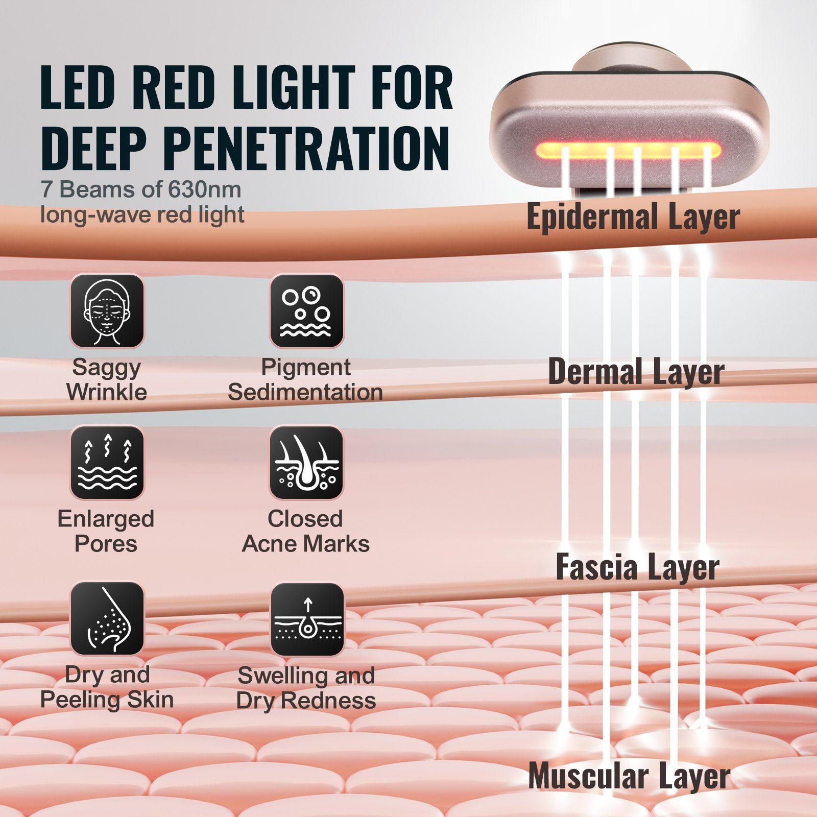 1.3-in-1 Red Light Therapy Wand: Say hello to radiant skin with VEVOR LED red light therapy wand for face! Featuring 7 beams of 630nm red light, microcurrent vibration massage, and soothing heating therapy, it's your go-to solution for comprehensive facial care, offering a professional, painless skincare experience right at home.